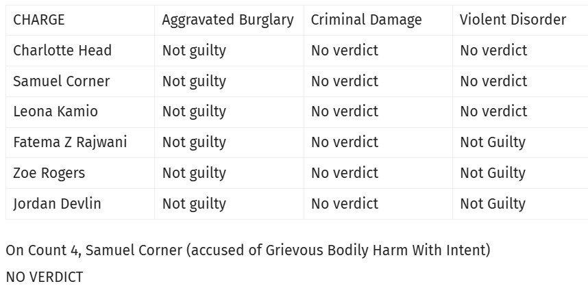 There are still 18 more defendants imprisoned across the UK in connection with this case. They are being held under joint enterprise which means they each have the same 3 charges whether they are accused of being present at the action or not. Now that the first 6 have been liberated of the most serious charge, Aggravated Burglary, and none were convicted of a single offence, it follows that the rest must immediately have this charge dropped against them, and be granted bail.